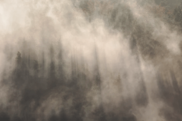spruce trees in heavy fog
