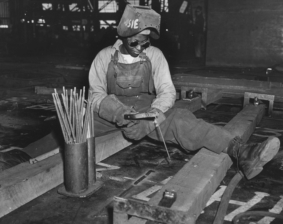 With nearly 1000 [African-American] women employed as burners, welders, scalers, and in other capacities at the Kaiser Shipyards in Richmond, California, women war workers played an important part in the construction of the Liberty Ship SS George Washington Carver, launched on May 7th, 1943. Welder-trainee Josie Lucille Owens plies her trade on the ship.